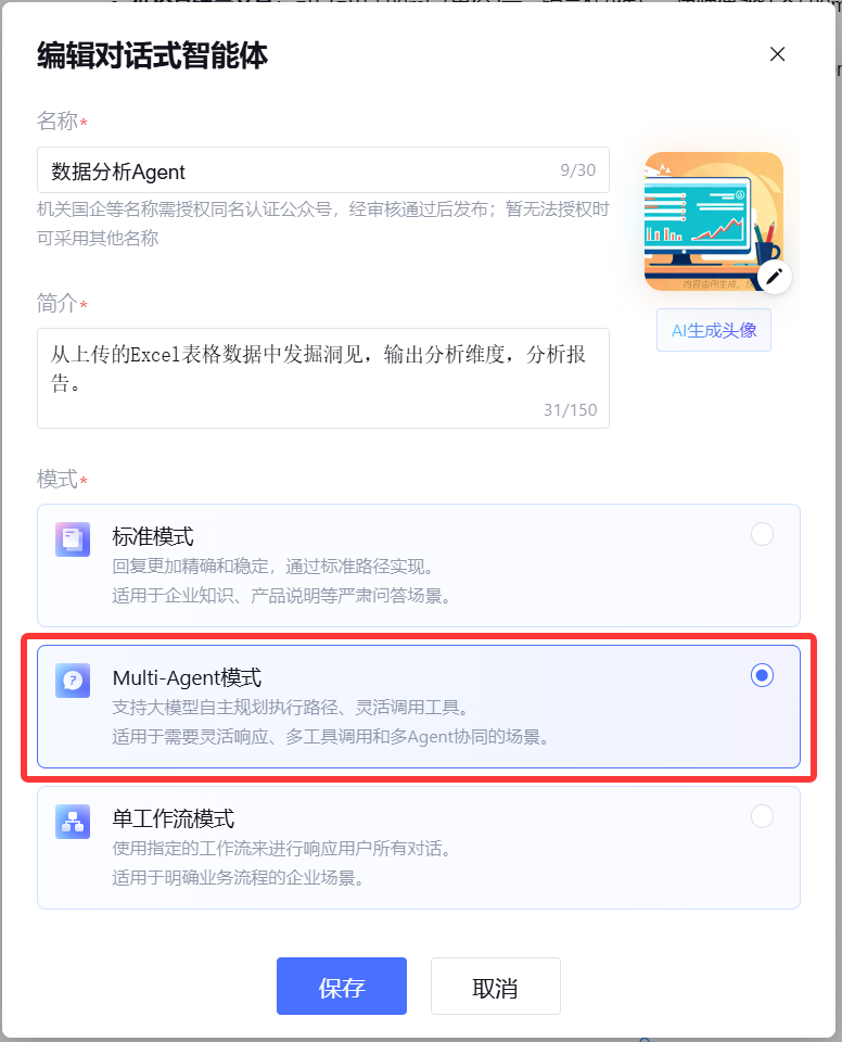 - 选择多Agent模式:因为需要多个Agent协作,选择"Multi-Agent模式"