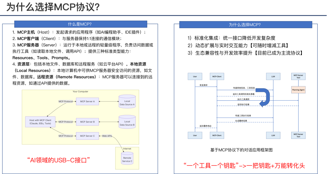用最通俗的话讲:MCP是一套“轻量且标准化”的工具集成协议,核心价值在于减少资源冗余和Prompt调试成本,让不同工具能被AI Agent统一调度。MCP主机(Host):发起工具调用请求的核心载体,比如我们开发的AI编程助手、IDE插件、智能问答系统等实际面向用户的应用程序;MCP客户端(Client):专门负责通信的“桥梁”模块,与MCP服务器保持1:1的专属连接,确保数据传输的稳定性和安全性