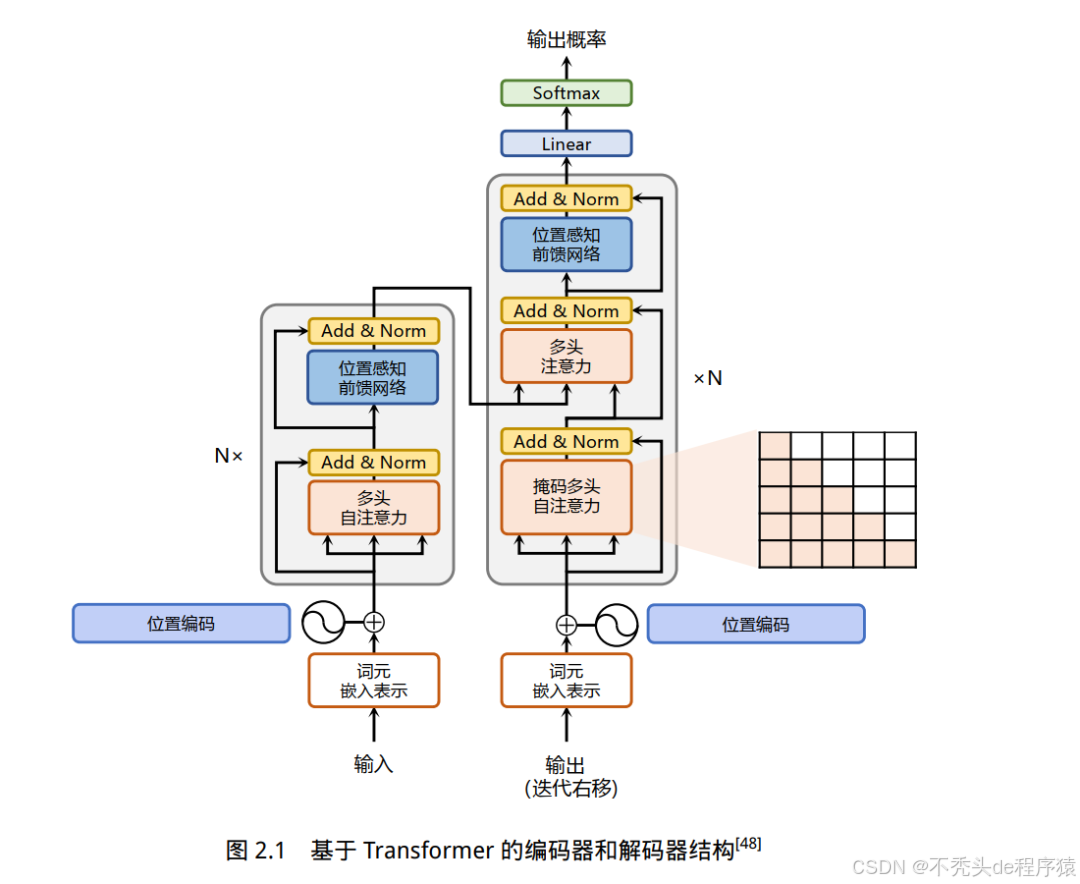 5、右边部分是解码器,从下往上看,前面的输出、token化、词元嵌入表示、位置编码这4部分跟编码器是一样的。不一样的是掩码多头自注意力机制、多头注意力机制