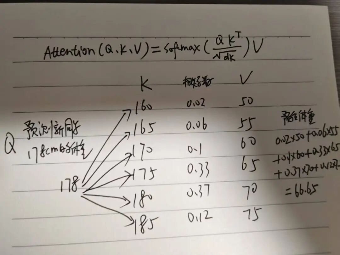 这个图是理解为一维的,也增加二维(身高178,腰围38),对应的K也要是二维的(身高,腰围),V值也加,比如预测(体重,腿长),还可以是多维的,大脑里细品哈,只要有数据,任何东西都可以预测。