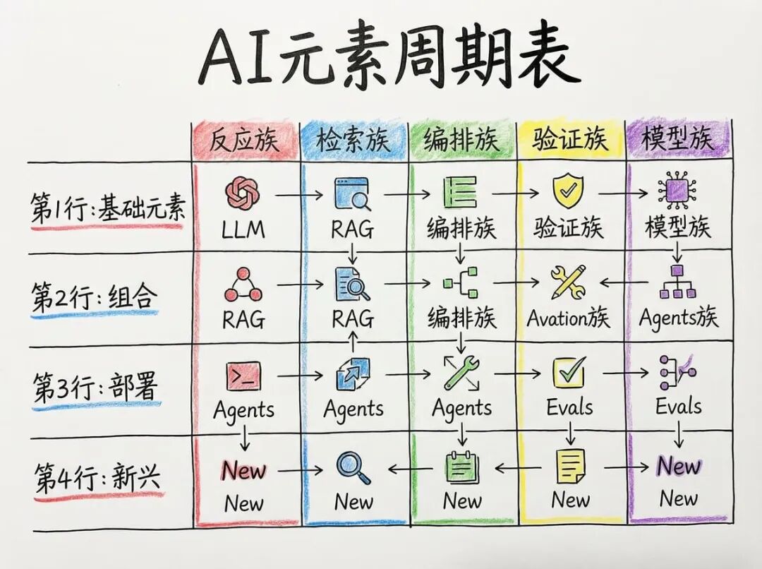 《AI元素周期表》提出结构化理解AI技术的框架,将技术按成熟度(4行:基础、组合、部署、新兴)和功能特性(5族:反应、检索、编排、验证、模型)分类。文章详细介绍了从提示、嵌入、大语言模型等基础元素到RAG、智能体等组合技术的层次结构,通过实际案例展示技术协同工作方式,帮助读者系统理解AI技术本质和关联,建立结构化思维。