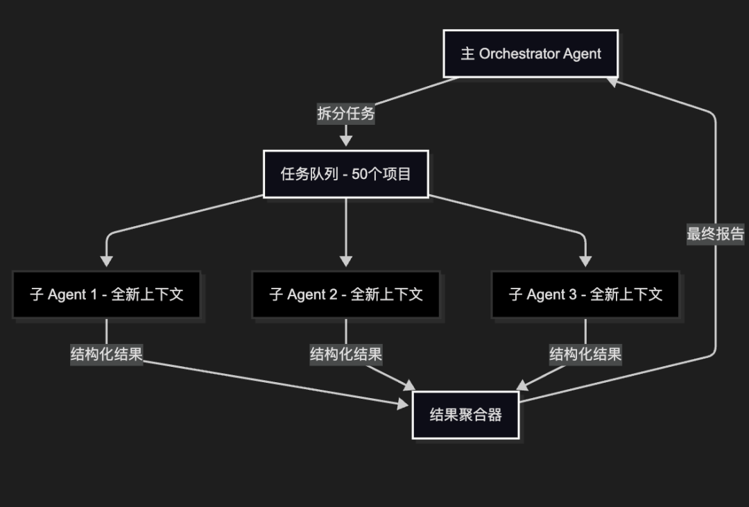 这是解决Agent长流程任务的最有效方法。放弃顺序处理模式,将复杂任务分解为 个独立的子任务,部署 个并行子代理。
