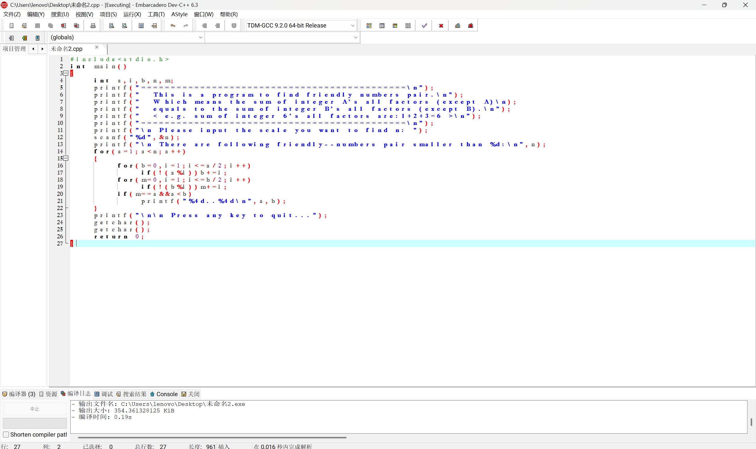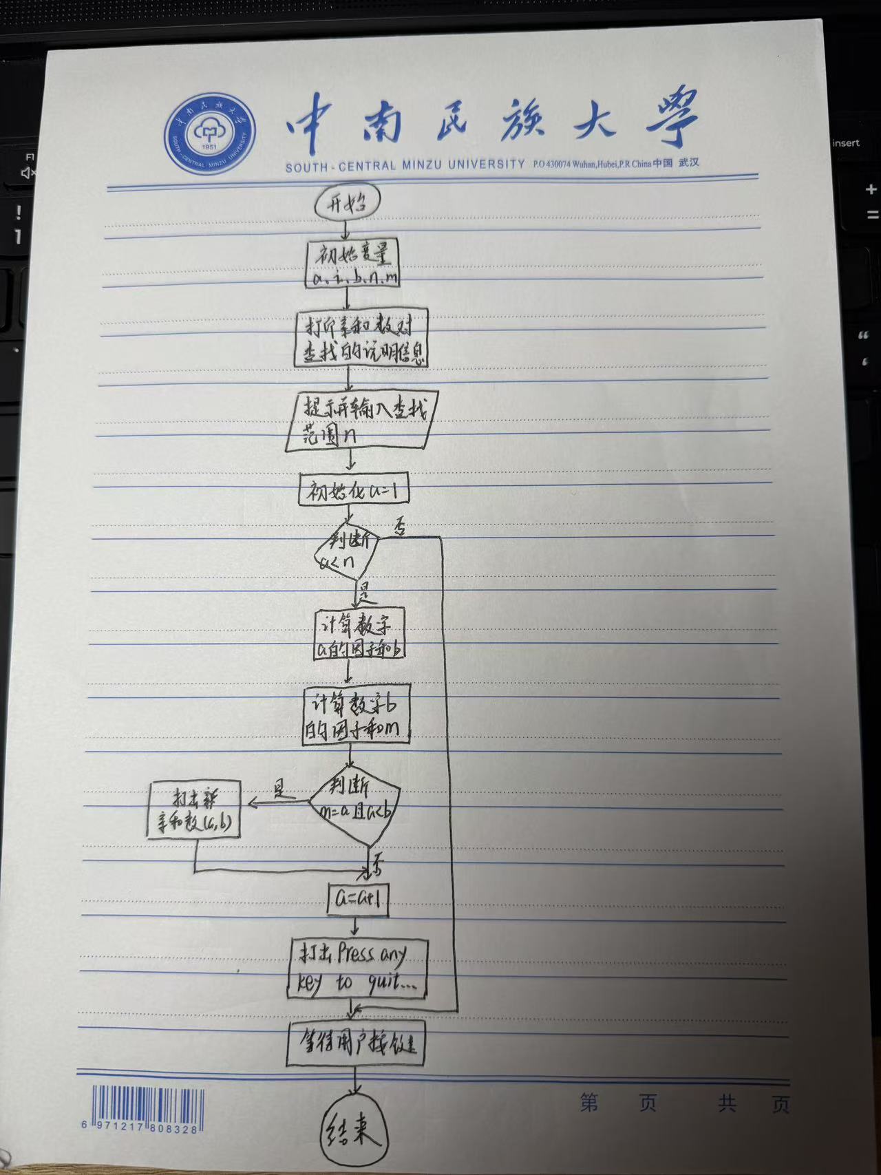 输入输出模块:通过printf函数输出亲和数定义说明与操作引导,界面友好且信息明确;采用scanf函数读取用户输入的查找范围n,结合%4d格式化输出亲和数对,确保结果显示整齐规范,提升可读性。因子和计算模块:作为代码核心,通过两层嵌套循环分别计算数字a与b的真因子和。其中,真因子定义为“除自身外能整除该数的正整数”,循环终止条件设为i≤a/2(或i≤b/2),因大于数字一半的数不可能成为其因子,该设计有效简化计算流程、提升运行效率。例如,计算a=220的真因子和时,循环遍历i=1至110,累加所有能整除220的整数,得到b=284;再通过相同逻辑计算b=284的真因子和,得到m=220,完成核心计算环节。亲和数判断模块:通过双重条件判断 “m==a&&a<b”筛选有效亲和数对。其中“m==a”确保满足“a的真因子和为b,b的真因子和为a”的亲和数定义,“a<b”则避免同一数对重复输出(如220与284仅在a=220时打印,a=284时跳过),保 证输出结果的唯一性与简洁性。