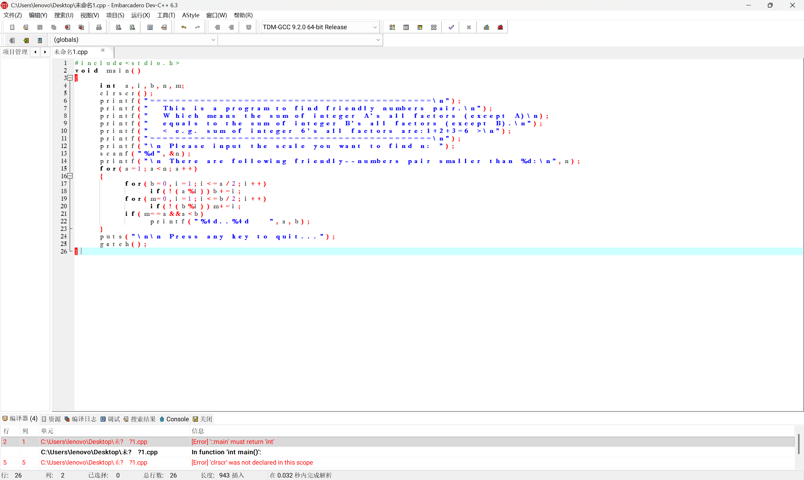 其中“m==a”确保满足“a的真因子和为b,b的真因子和为a”的亲和数定义,“a<b”则避免同一数对重复输出(如220与284仅在a=220时打印,a=284时跳过),保证输出结果的唯一性与简洁性。本次课程任务围绕复古C语言游戏代码展开修复与解析工作,选取编号66的代码为研究对象,通过Dev-C++、VSCode等编译工具完成代码的编译、调试与错误修正,解决了古老C语言语法与现行标准不兼容的问题,