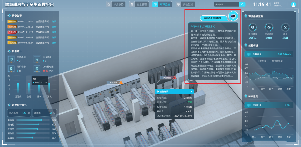 结合数字孪生实时反馈数据(如某机房空调异常停机),自动更新知识库规则,实现“越用越聪明”。