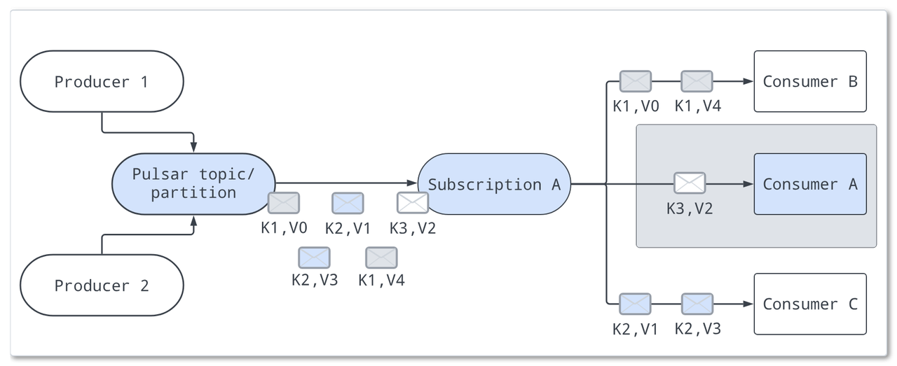 | Key_Shared(键共享) 是 Pulsar 的一种订阅模式,它在 Shared 模式的基础上增加了按消息 Key 的路由规则:相同 Key 的消息始终被分配到同一个消费者,而不同 Key 的消息可分布在多个消费者上并行处理,实现 Key 级别的有序性与负载均衡。