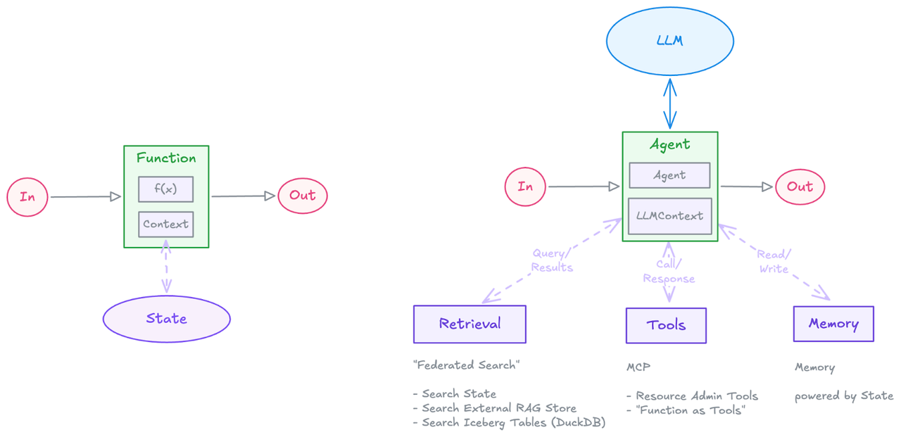 Pulsar 除了以上在消息中间件的优势外,还提供了 Function Mesh 的能力,利用 Function 的能力可以更进一步简化 AI Agent 的架构: