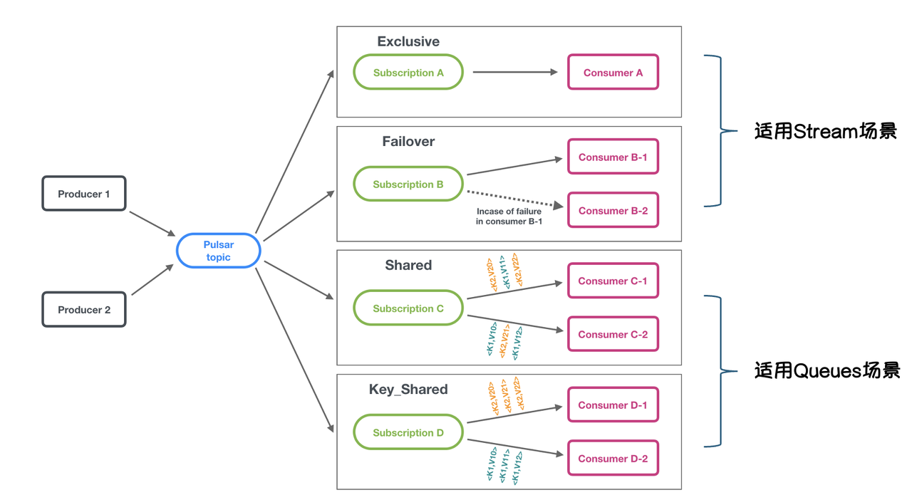 | Pulsar 的流(Streaming)和消息(Messaging)场景结合,通过 Key-shard(键共享)、Failover(故障转移)、Exclusive(独占)、Shared(共享)四种订阅模式来实现