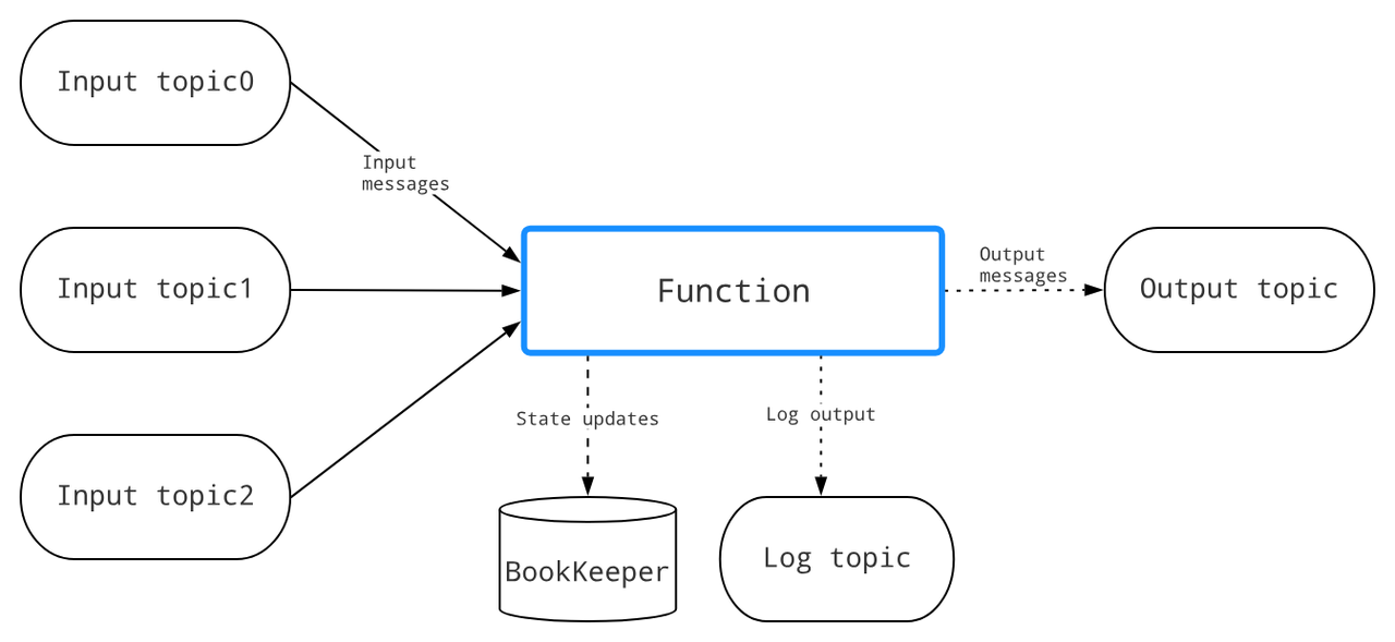 | Pulsar Function :Pulsar 提供的轻量级、Serverless 流处理框架,定位是“用写普通函数的代码量,完成 ETL、过滤、聚合、打标签等实时计算”。它把“消息 → 计算 → 消息”的闭环直接跑在 Pulsar 集群内部,简单场景不需要额外部署 Flink、Storm 等重型流处理引擎。