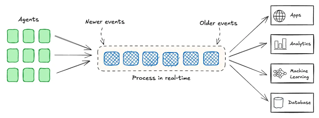 类似传感器流,生产者将数据追加到一个无界、有序的日志(即流)中。消费者随后按顺序从这个日志中读取数据,并维护流中的偏移量(offset)。每个分区内的顺序是有保障的,消息在消费时不会被移除,这就是 kafka 专注的 stream(流)场景,它提供了高吞吐量和分区的严格排序,这使得它非常适合处理有序的事件流。