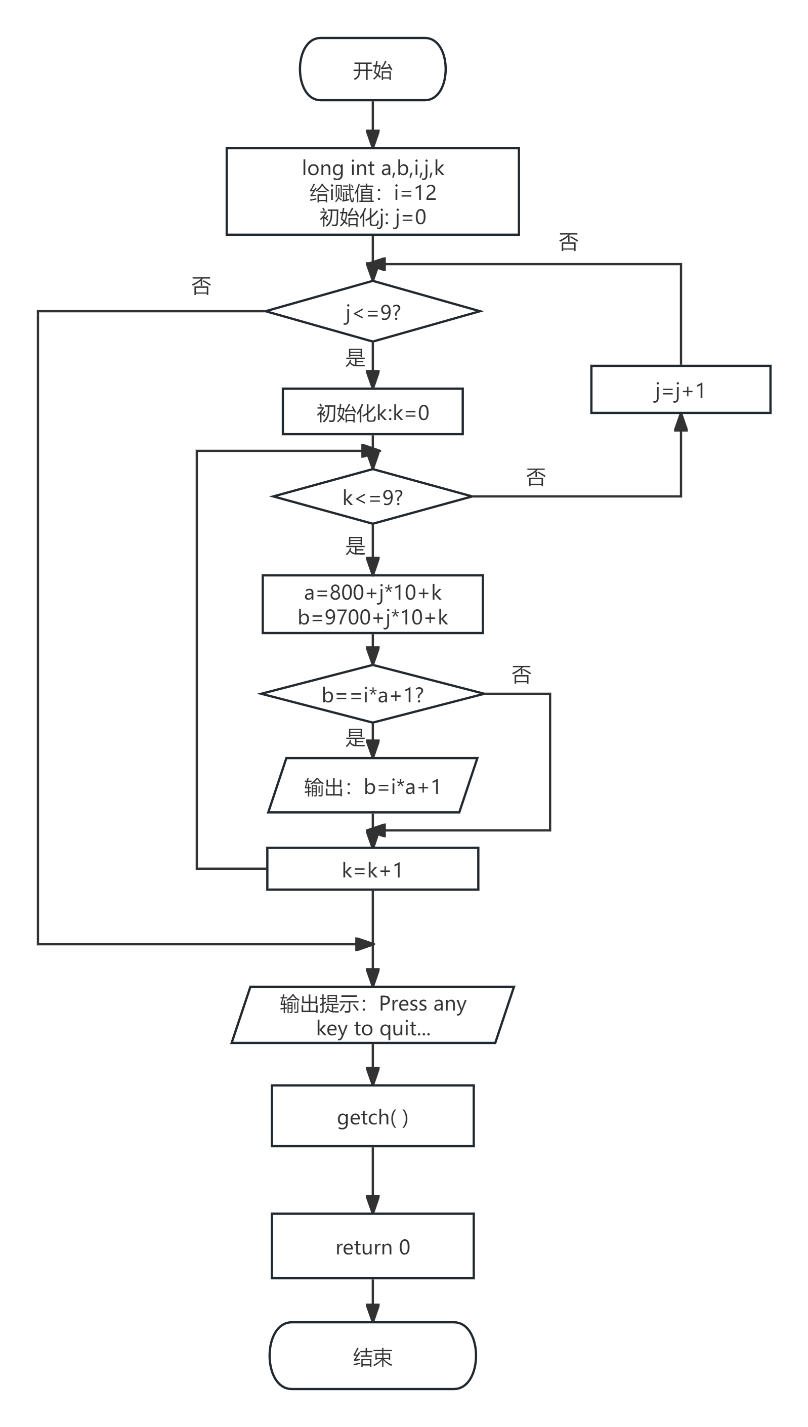 2. 通过嵌套循环遍历 j 与 k 的所有取值,逐一验证 b = i*a + 1 的等式关系是否成立;
