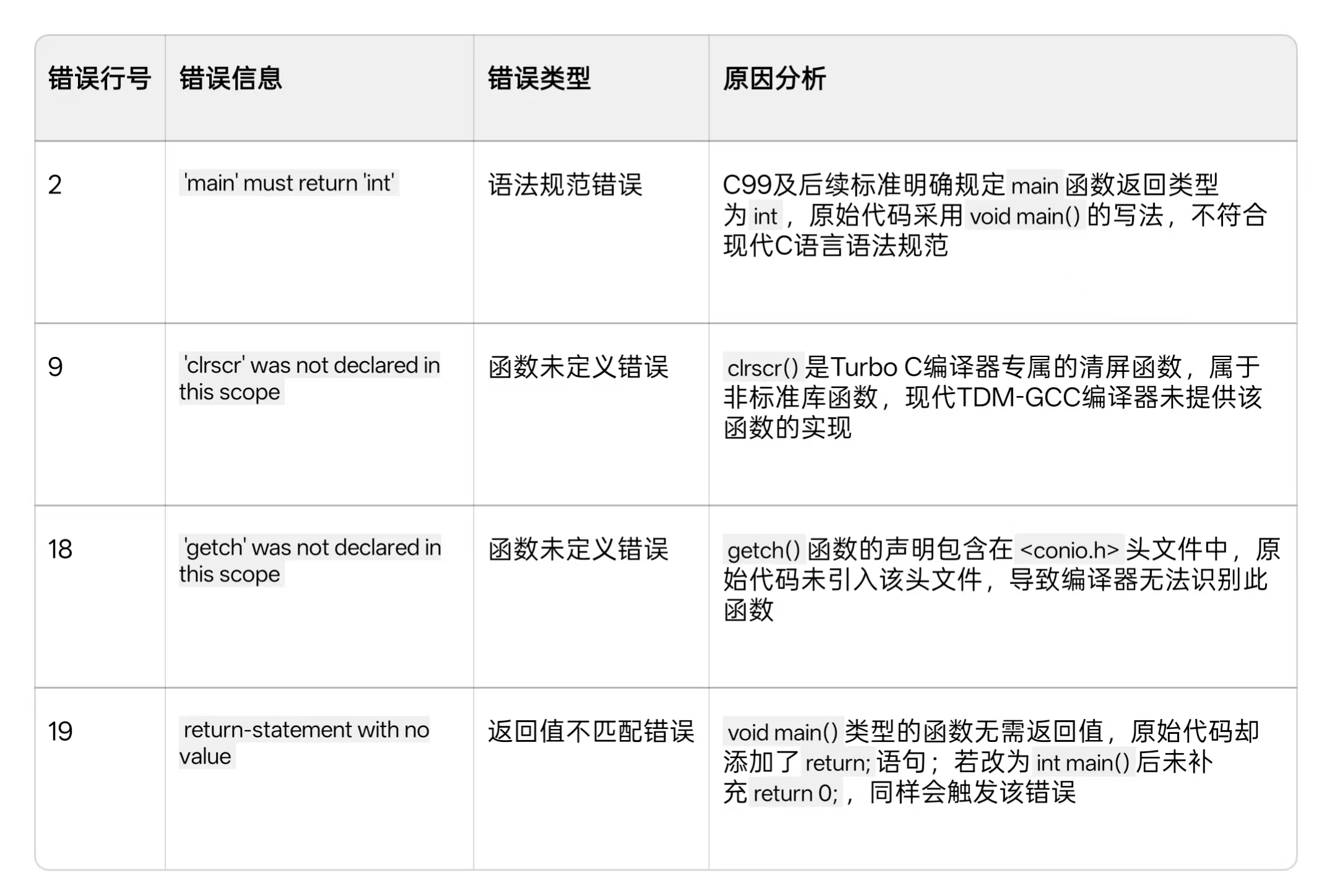 1. 规范 main 函数写法:将 void main() 修改为符合标准的 int main() ,并在函数末尾添加 return 0; 语句,以此向操作系统反馈程序正常退出的状态。