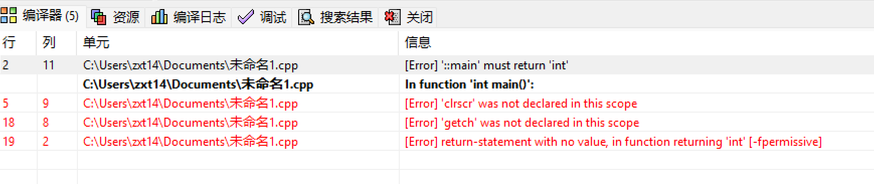 将159号原始代码导入Dev-C++进行编译,触发4项核心编译错误,各项错误的具体信息与成因分析如下表所示: