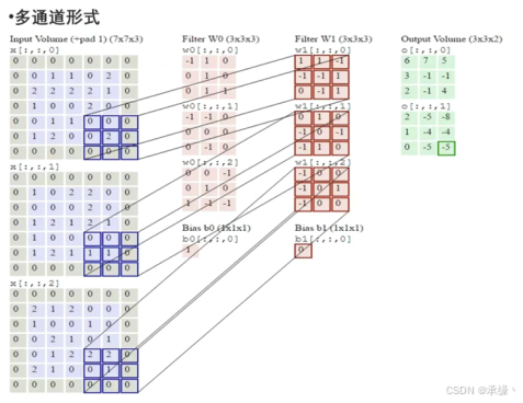 在处理彩色图像(RGB三通道)或多层特征图时,卷积核的“深度”与输入通道数一致。它在所有通道上分别进行卷积后,将结果相加,并加上一个偏置项,最终生成单通道输出。使用多个滤波器,即可产生多通道的输出特征图。
