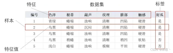 特征值:样本在某个特征上的具体取值(如“青绿”、“蜷缩”)。