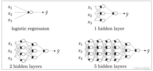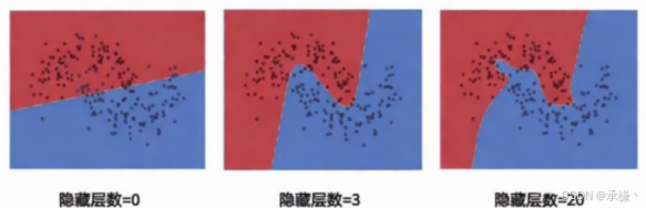 网络:多层连接形成网络。图中清晰展示了随着隐藏层数增加,模型能拟合极其复杂的非线性决策边界,这是深度学习“深度”力量的直观体现。