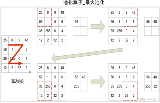 池化层通常跟在激活层后,对特征图进行下采样,其没有可训练参数。