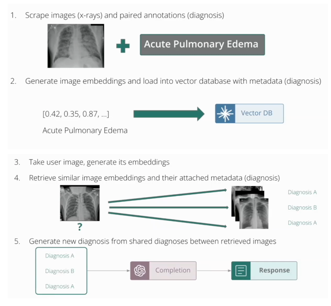 第一步,图像预处理:用户上传 X 光图与诊断,其中, X 光图系统生成 embedding后,与元数据(诊断)一起加载到Milvus/Zilliz向量数据库