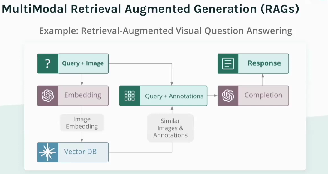 - Completion(完成):检索到的数据(相似图像及其注释)与原始输入查询结合,形成大模型生成响应的上下文窗口。