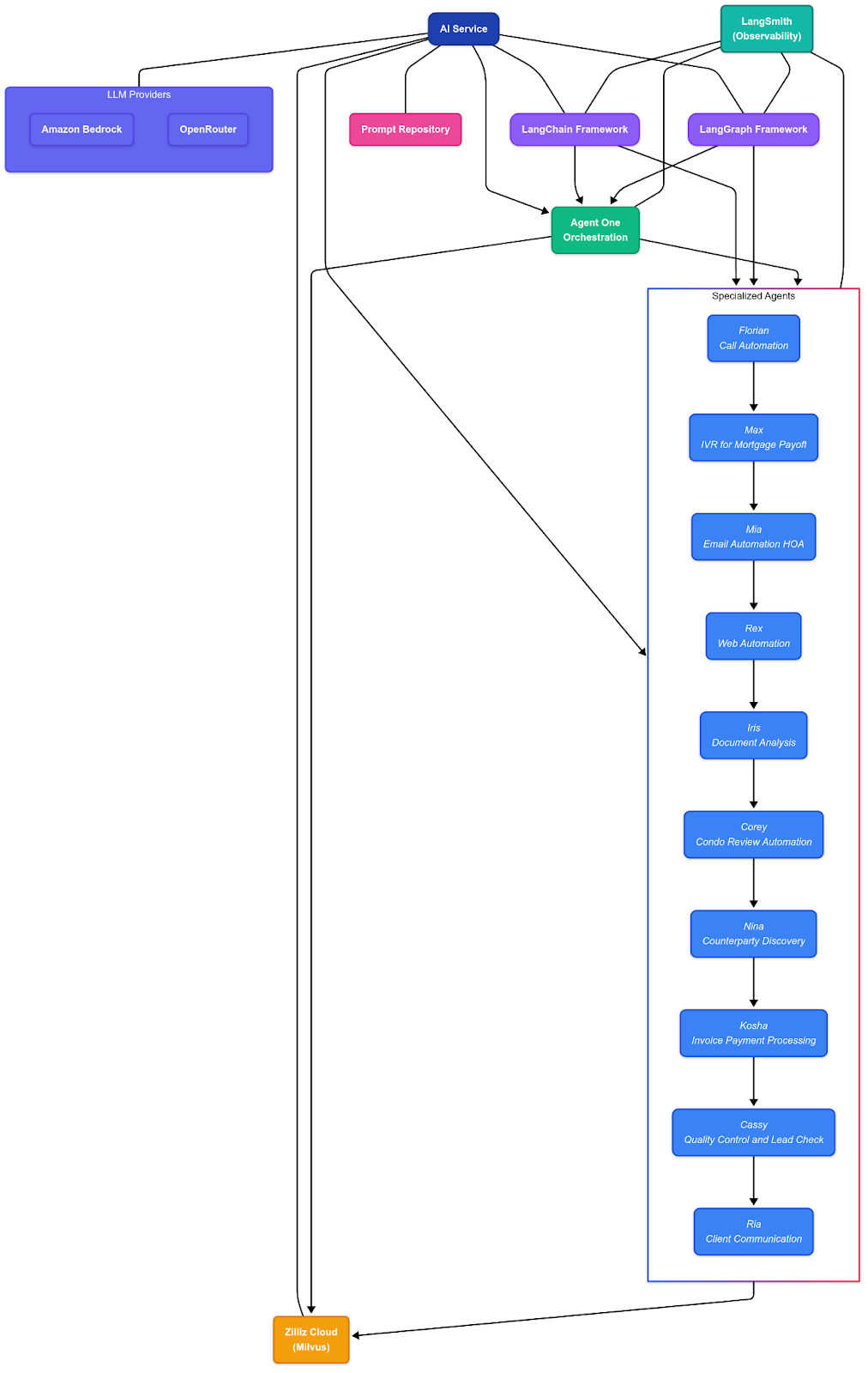 Rexera 的 AI agent架构是一个模块化、生产级系统,专为大规模交易自动化而构建。其核心是Agent One,这是一个由 LangChain 的可组合工具和 LangGraph 的动态工作流驱动的集中式编排器,并由 LangSmith 提供跨链可观察性。这一分层架构支持在自动化任务(如呼叫自动化、Web 自动化、文档分析等)中实现可调优、可解释的agent行为。