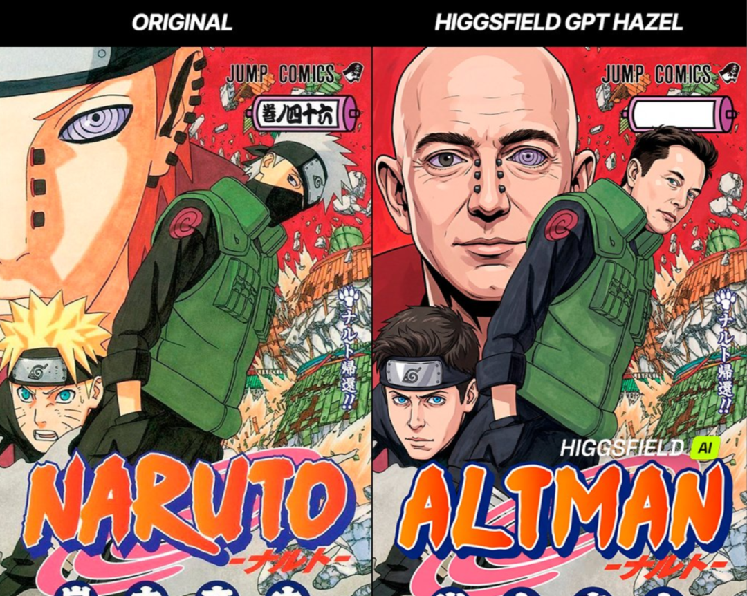 然后还可以继续在之前生成的图片之上,再添加更多的图片元素:左边那男的改成手绘复古日漫风,狗改成毛绒公仔,右边那男的和背景都别动。再让他们全部穿上OpenAI定制衣服。
