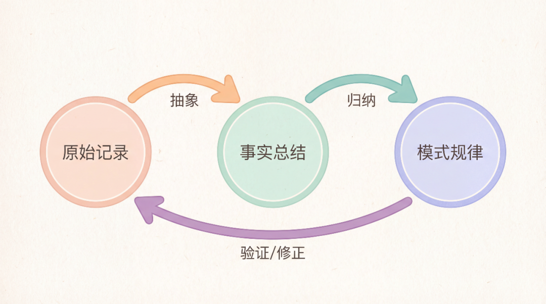 - • 抽象层次:原始 → 事实 → 模式