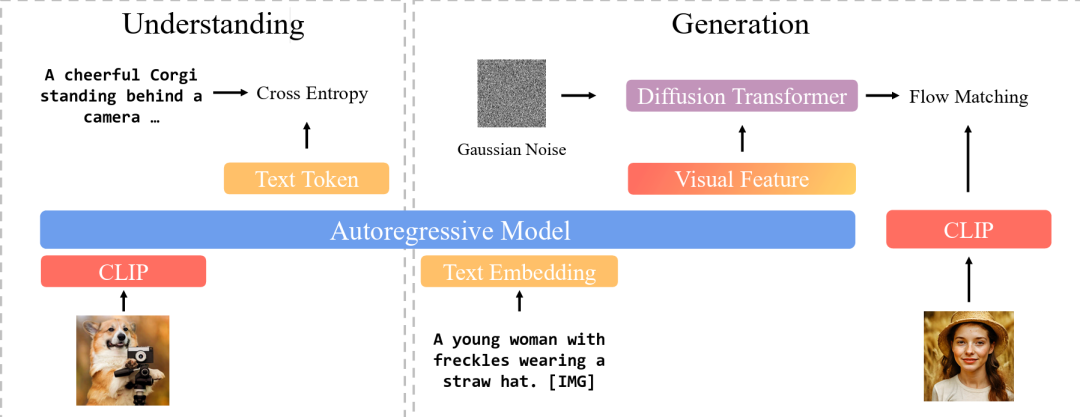 用CLIP作为统一语义空间,让理解与生成共享同一套语义表示: