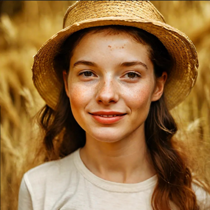 以提示词 “A young woman with freckles wearing a straw hat” 为例: