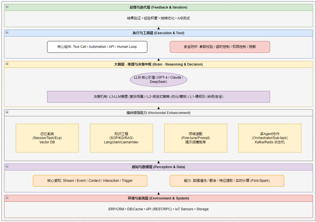 - 大脑层(LLM + 推理引擎):任务理解与分解、RAG 检索、策略推理(CoT/ToT)、动作规划