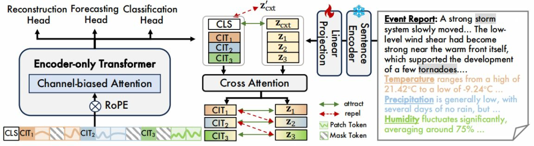 图3:TRACE框架示意图。该模型通过通道偏置注意力机制对多元时间序列进行编码,并借助交叉注意力与双层级对比学习,将标记嵌入向量(如z_i与z_{cxt})与其对应的文本描述对齐。z′_{cxt}表示批次内的困难负样本。