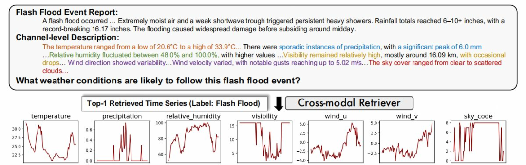 想象一下,你是一位气象学家,面前有一份描述“突发洪水”的报告,里面提到了“极端降雨”和“强阵风”。你的直觉会告诉你,要理解这次事件,最好能找到历史上发生过类似天气模式的时间序列数据(比如过去几十年的风速、降雨量记录)。这种将文本描述与历史数据模式联系起来的能力,就是跨模态检索的核心。