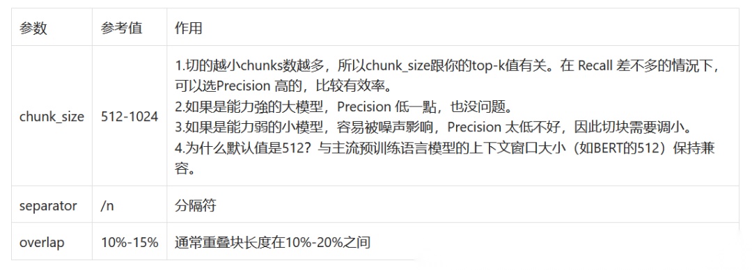 现实中不存在一种“one-for-all” 的数据读取和分块方法,特别像是 PDF 和 Word 这类复杂格式的文档。比较流行的方案是实用DeepDoc(OCR、TSR、DLR),所以实际中应根据业务,制作不同的模板。那么评估Chunk的参数和指标有哪些呢? 指标就是Precision和Recall,详细看表格**:**