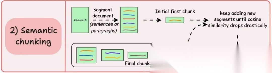 - 工作方式:通常通过计算句子 Embedding 的余弦相似度,当相似度低于某个阈值时进行分割。