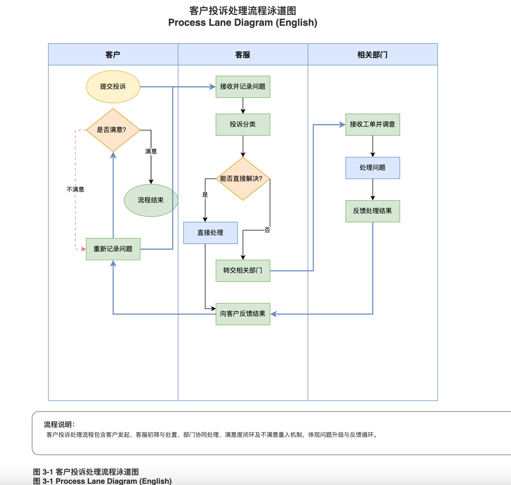 其二,二维泳道图逻辑梳理复杂,手动绘制效率低。二维泳道图需同时兼顾“角色维度”(纵向泳道)与“流程维度”(横向步骤),对于多角色、多分支的复杂流程,梳理逻辑关系已十分繁琐,再通过Visio、DrawIO等工具手动拖拽组件、连接流程线,往往需要花费数小时,且修改时需联动调整多个关联节点,严重影响作业进度。