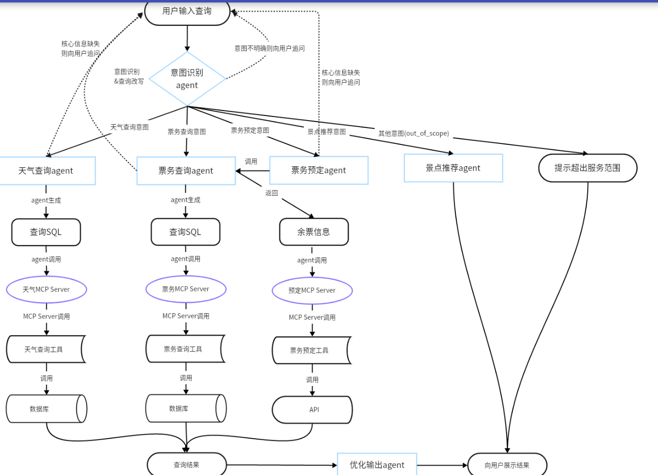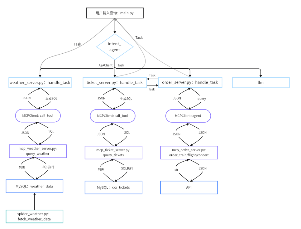 本文介绍了一个基于Agent2Agent架构的智能旅行助手系统,该系统整合了天气查询、票务查询与预订、景点推荐等功能。系统采用模块化设计,包括数据获取、数据库管理、MCP工具开发和Agent服务实现等核心模块。天气数据通过和风API获取并存储到MySQL数据库,票务信息则直接查询数据库。系统通过意图识别Agent分析用户查询,并路由到相应的专业Agent处理任务。各Agent使用LLM+Promp