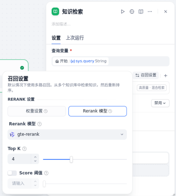 3、知识库召回设置:使用 Rerank 模型重排序,TopK 设置为 4,不限制 Score 阈值。