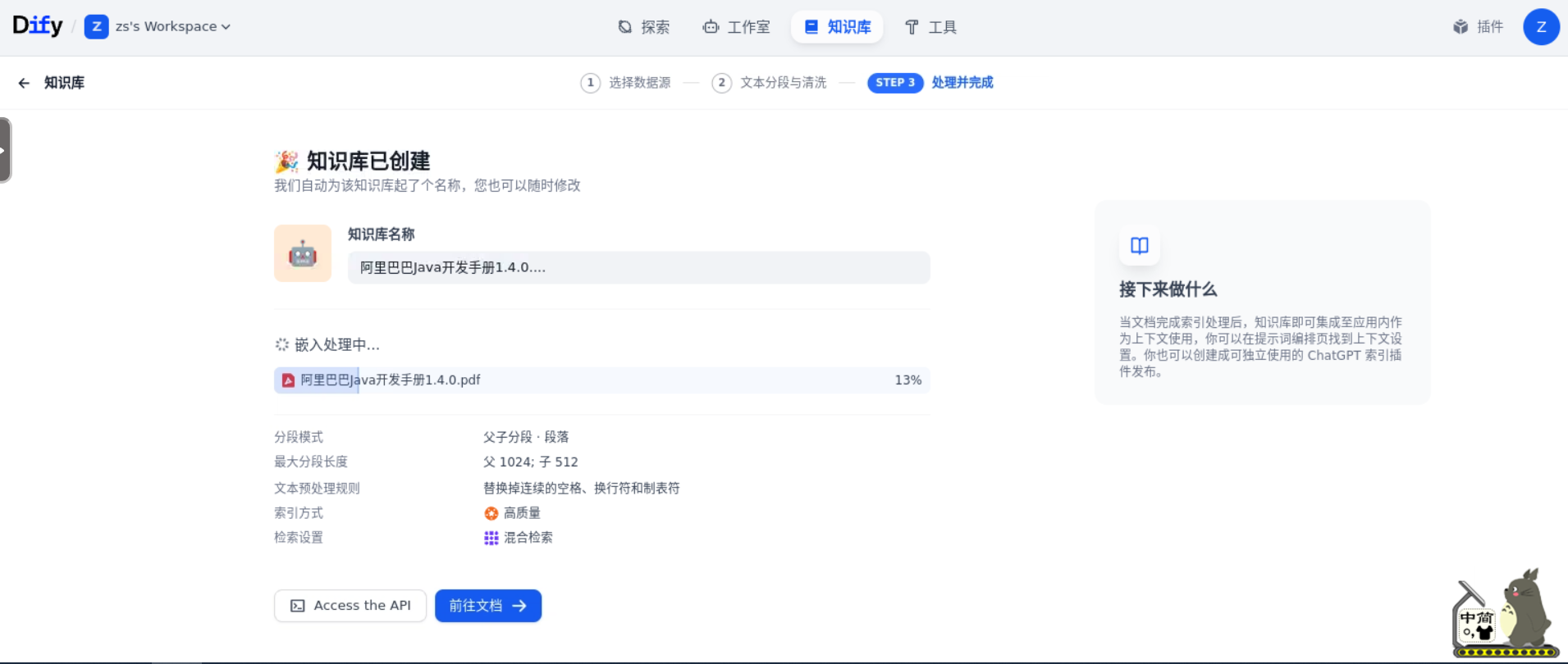 刚创建的知识库,还需要调用 Embedding 模型做向量化及存储,需要一点时间才能完成。