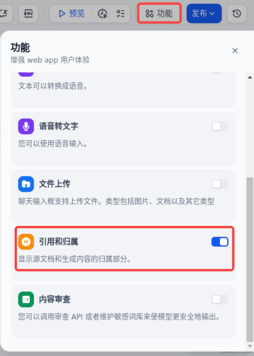 点击“功能”,勾选“引用和归属”,这样回答用户的时候,就能把知识库的引用部分也显示出来。