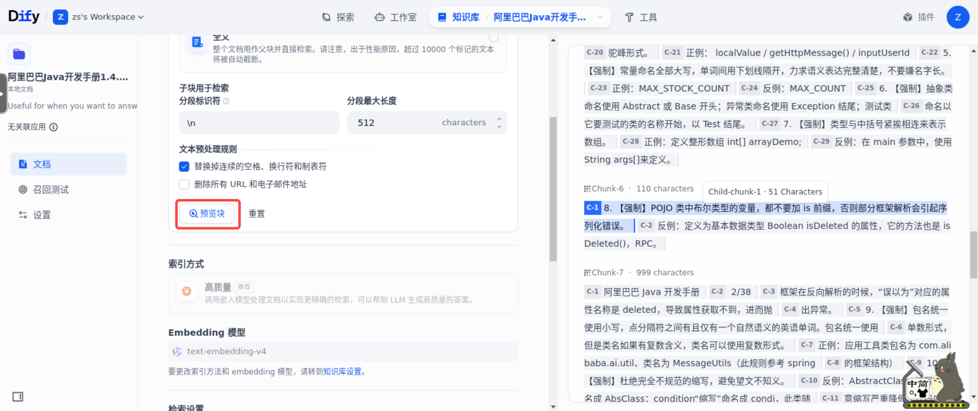 本文介绍了如何利用Dify平台构建《阿里巴巴Java开发手册》智能助手。首先详细讲解了知识库创建的完整流程,包括文档上传、分段设置(推荐父子分段+段落上下文)、索引方式选择(高质量+混合检索)等关键步骤。随后指导用户进行分段质量检查和召回测试,强调TopK和Score参数的调优策略。接着演示了Chatflow应用开发过程,通过知识检索节点和LLM节点的配置,实现从知识库智能获取答案的功能。最后展示