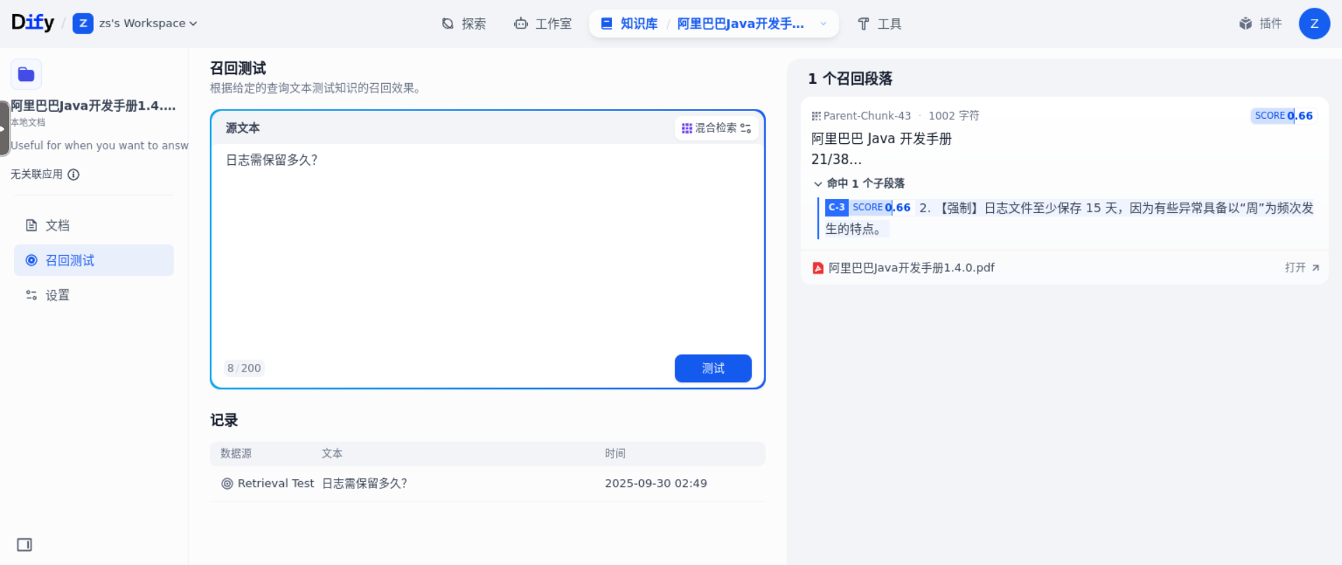 示例 1:“日志需保留多久?”召回了 1 个子分段,Score 为 0.66。