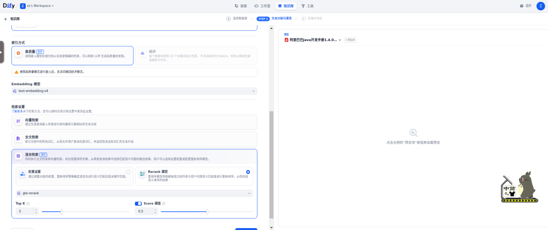 索引方式:选用高质量 + 混合检索方式。使用 Embedding 嵌入模型将已分段的文本块转换为数值向量,帮助更加有效地压缩与存储大量文本信息;使得用户问题与文本之间的匹配能够更加精准。将内容块向量化并录入至数据库后,需要通过有效地检索方式调取与用户问题相匹配的内容块。注意:选择高质量索引方式后,无法降级到经济索引模式。如需切换,只能重建。