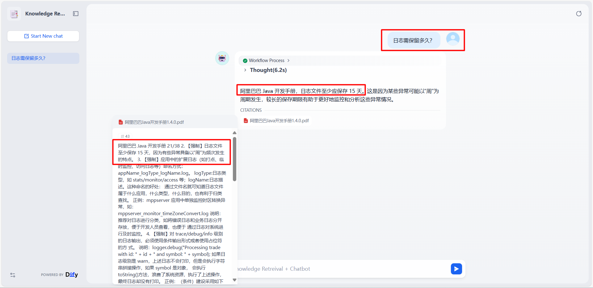 输入“日志需保留多久”,然后就会运行工作流并返回知识库的引用结果。