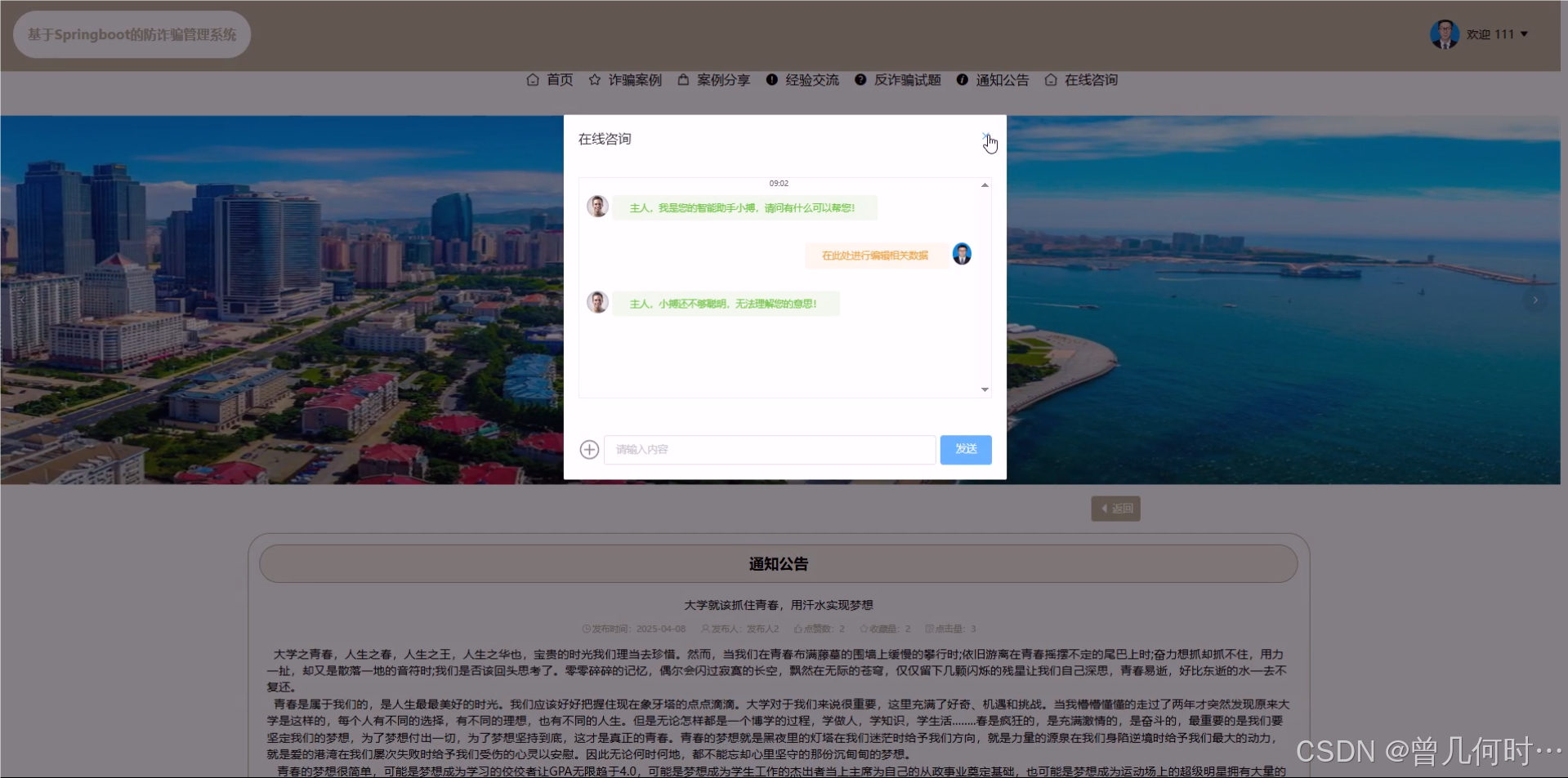 前台首页信息有诈骗案例、案例分享、经验分享、反诈骗试题、通知公告、在线咨询