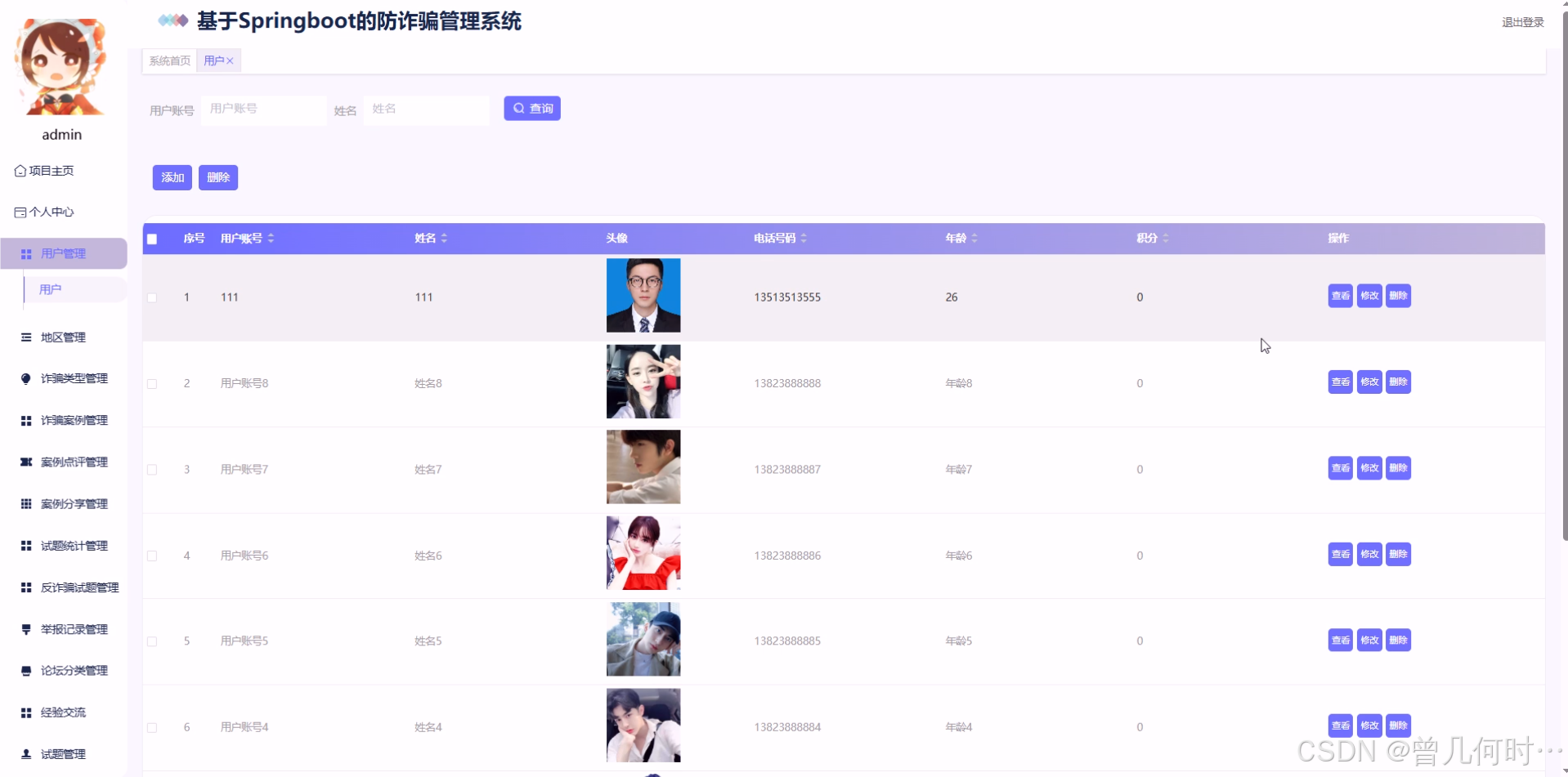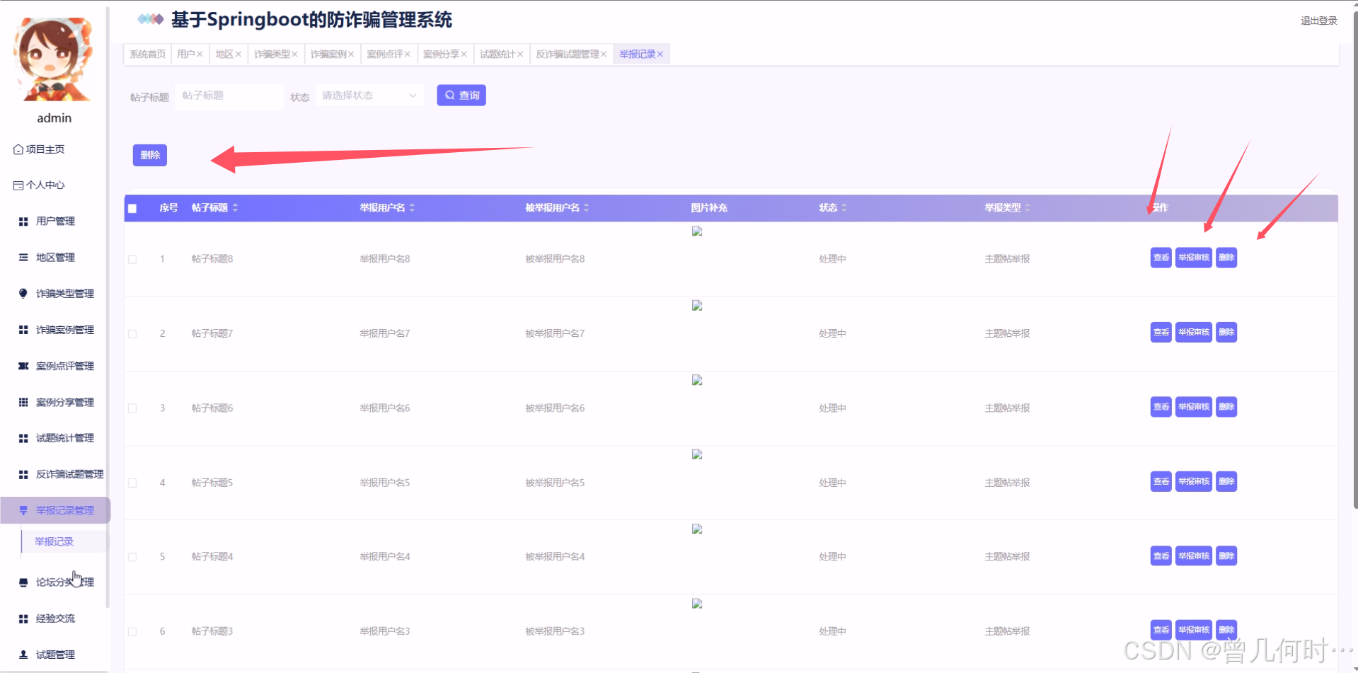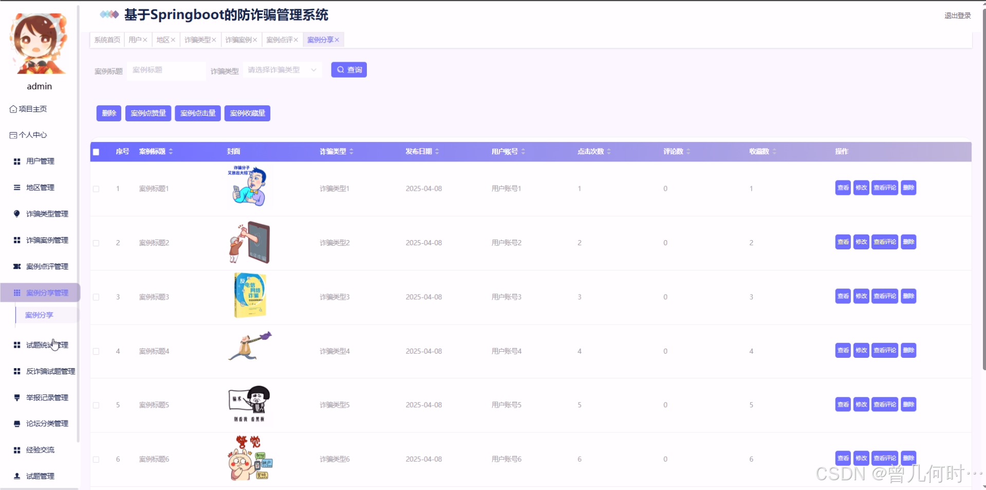 管理员进入系统后台有用户、地区管理、诈骗类型管理、诈骗案例、案例点评、案例分享、试题统计、反诈骗试题、举报记录、论坛分类、经验交流、试题管理