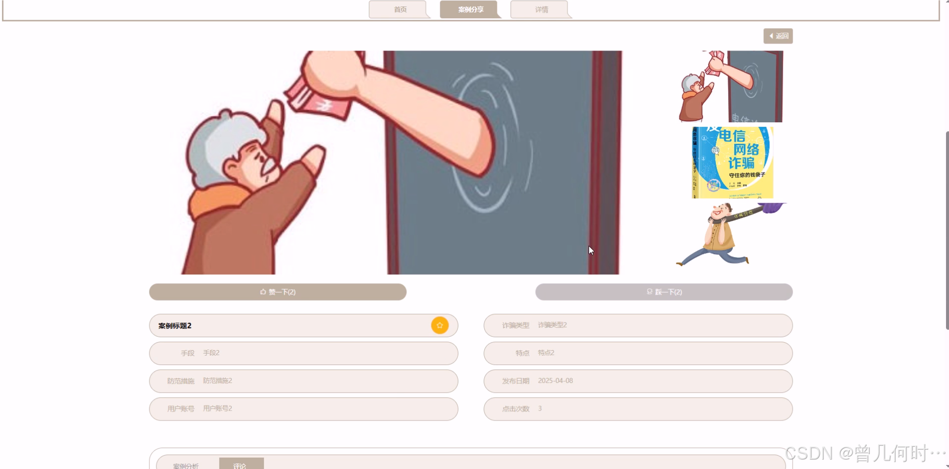 前台诈骗案例详情页面,用户可以进行点评、查看视频,提高诈骗意识