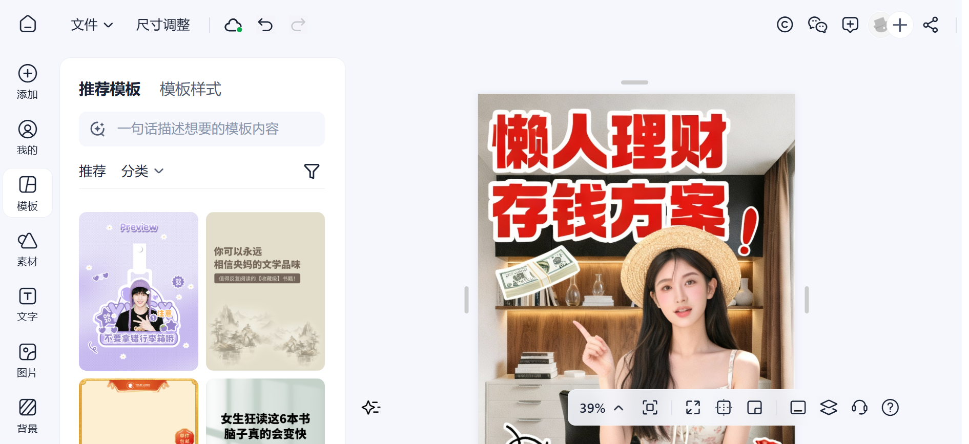 - 强大的在线设计编辑器:抠图后可对图片进行进一步的编辑处理,比如换背景、添加文字、批量导出png等不同格式文件、智能调整尺寸,还能配合海量的设计模板创作海报、封面、商品主图等。一站式设计制作流程,不用在不同工具间来回切换。