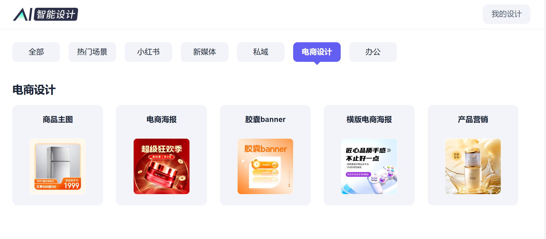 比如智能设计,该功能已经预设好了多种设计场景,根据你的需求点击选择一种场景,根据页面提示输入相关内容即可用AI快速完成一份设计;