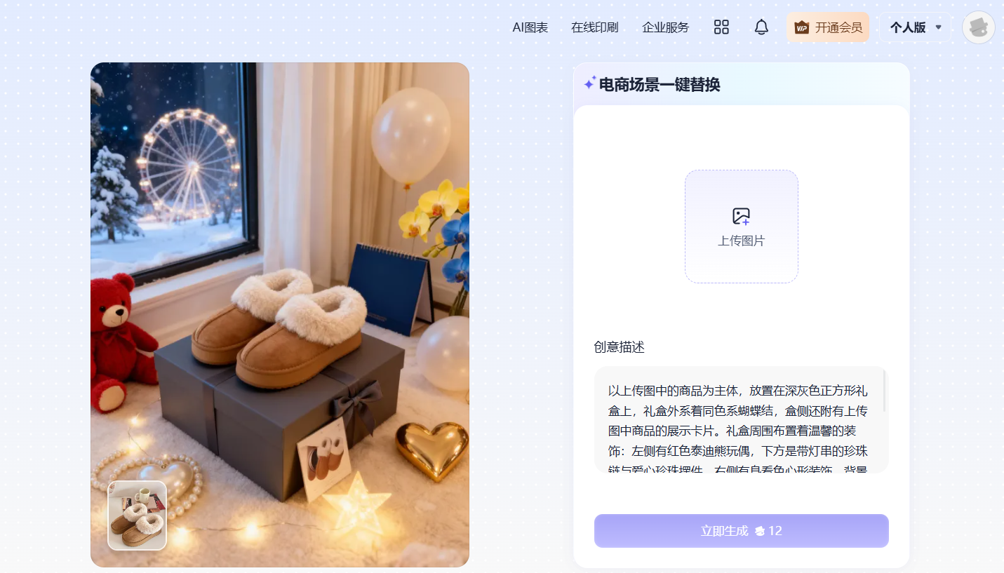再比如AI商品图,“爆款电商玩法”可以一键替换商品,让你的商品更出圈;你也可以自己输入一段你想要生成的效果描述,AI就会自动生成多种场景商品图,提升电商内容效率。