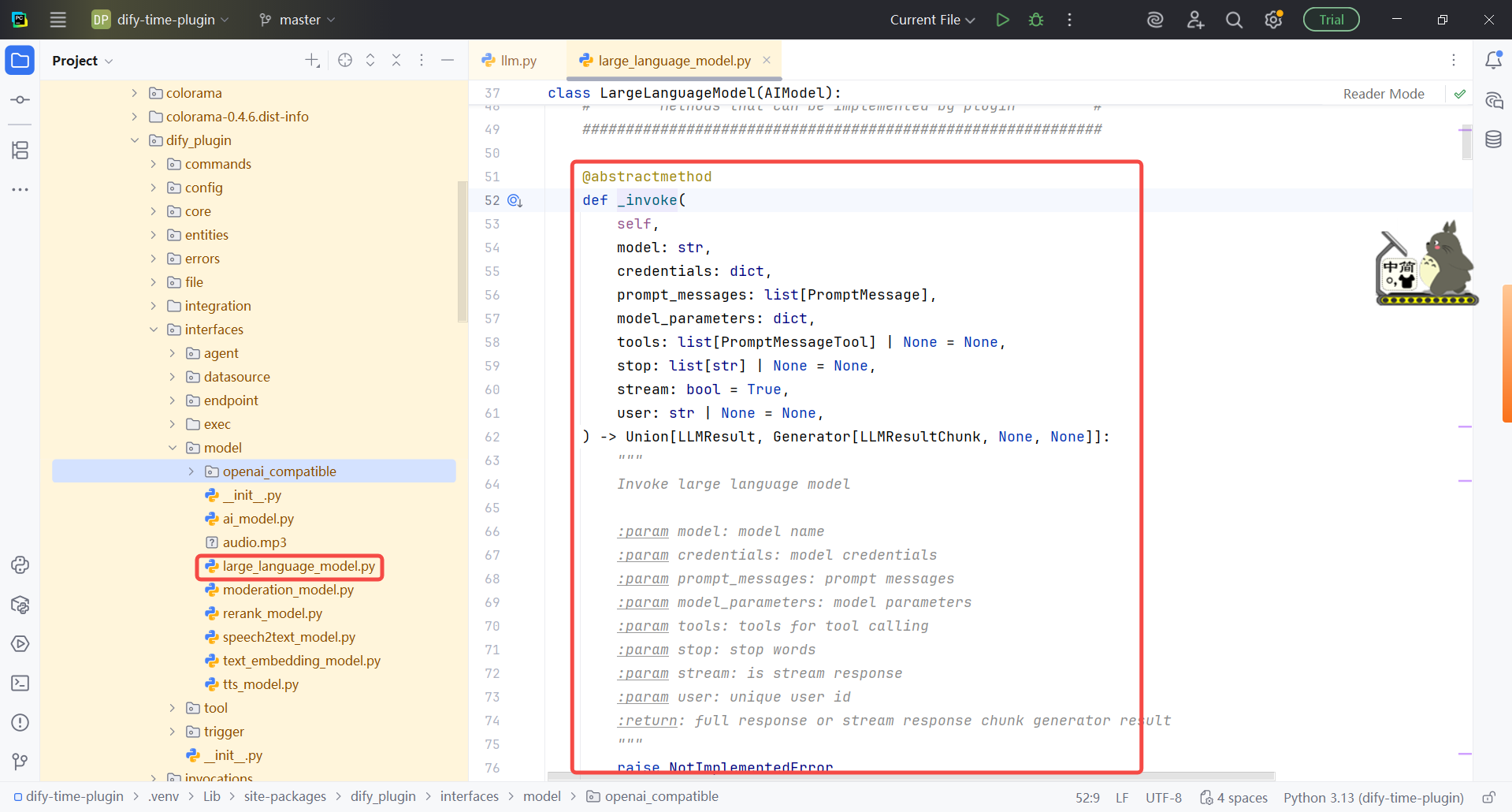 插件反向调用 Dify 上的 Model,利用 self.session.model来调用模型。包括调用 LLM、Summary、TextEmbedding、Rerank、TTS、Speech2Text 和 Moderation 模型的具体方法。