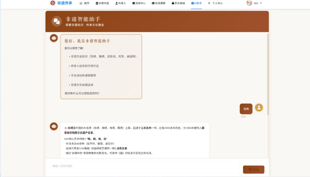 智能交互:作为系统亮点,我们引入Spring AI模块。Spring AI为集成大型语言模型(LLM)等人工智能能力提供了便捷的Spring风格抽象。在本项目中,它可以赋能于智能问答(例如,用户可询问非遗技艺细节)、内容智能生成(辅助生成非遗介绍文本)、知识图谱关联推荐(根据用户兴趣推荐相关非遗项目)等创新功能,极大地增强了系统的交互性与知识服务能力。